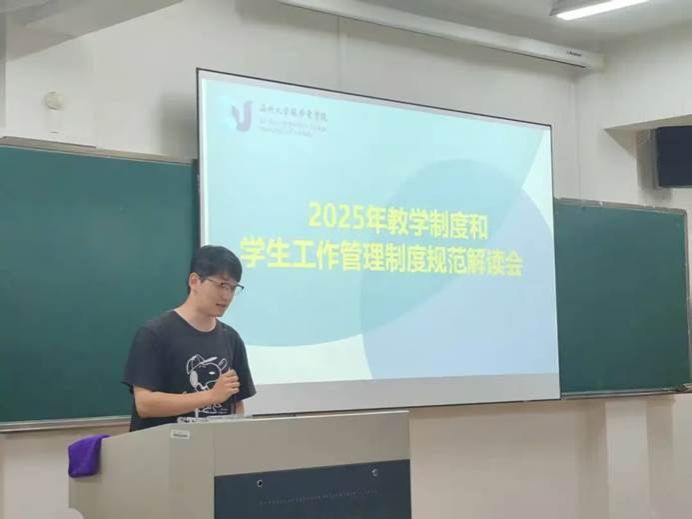 紧接着,李金伟针对学生管理相关文件进行了系统性的介绍与说明。他着重讲解了学生日常行为规范、奖助勤贷政策的实施细则以及思想政治教育的重点方向,并就学生突发事件处理、心理疏导介入等常见工作流程与在场同学开展说明,为今后扎实推进育人工作奠定坚实基础。